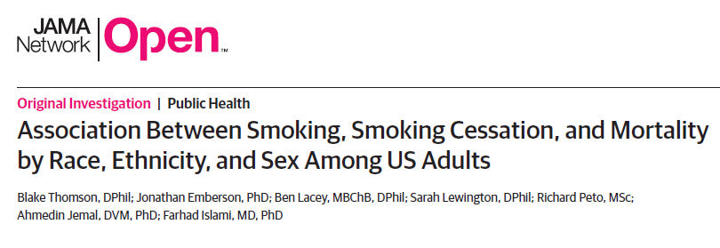 2022年10月24日,美国癌症协会、英国牛津大学的研究人员在"JAMA Network Open"期刊上发表了一篇题为"Association Between Smoking,Smoking Cessation,and Mortality by Race,Ethnicity,and Sex Among US Adults"的研究论文。