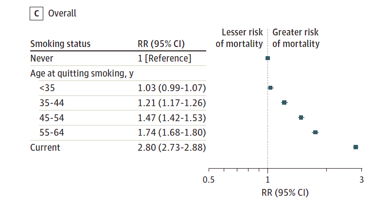 在35岁之后戒烟,仍然有很大的益处,与从不吸烟的人相比,在35-44岁之间戒烟,全因死亡风险高21%,在45-54岁之间戒烟,全因死亡风险高47%。
