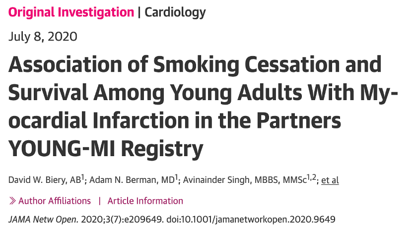 同时2020年7月8日,来自美国波士顿哈佛医学院附属布莱根妇女医院心血管内科的Ron Blankstein团队,在JAMA杂志在线发布了一篇题为“Association of Smoking Cessation and Survival Among Young Adults With Myocardial Infarction in the Partners YOUNG-MI Registry”的文章,研究结果表明,在心肌梗死发生后的1年内戒烟,于全因死亡及心血管病相关死亡率降低显著相关。
