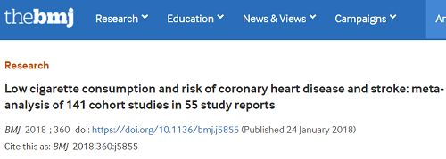 论文出处:Allan Hackshaw et al. Low cigarette consumption and risk of coronary heart disease and stroke: meta-analysis of 141 cohort studies in 55 study reports. BMJ. 24 January 2018.