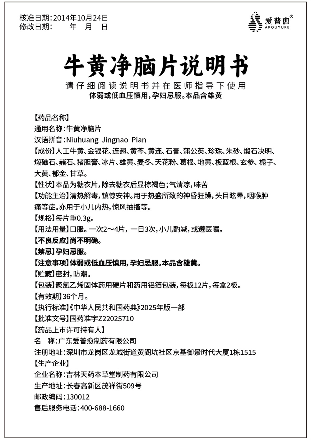 【成分】人工牛黄、金银花、连翘、黄芩、黄连、石膏、蒲公英、珍珠、朱砂、煅石决明、 煅磁石、赭石、猪胆膏、冰片、雄黄、麦冬、天花粉、葛根、地黄、板蓝根、玄参、 栀子、 大黄、郁金、甘草。
